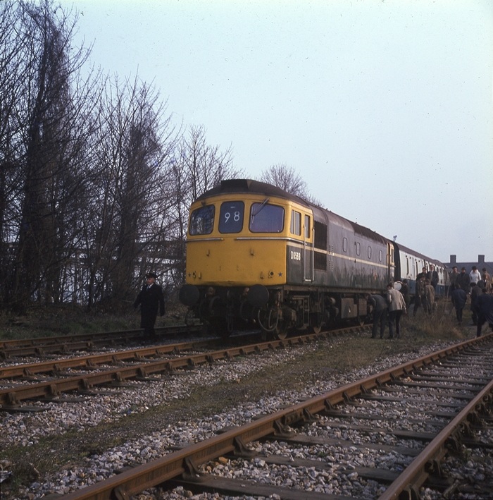 Type 3 diesel No. D6568 (later Class 33 No. 33050) is seen at Gravesend West in the month the site was formally closed to all rail traffic. It was hauling ''The Invicta Rail Tour'', which had arrived from Blackfriars via Herne Hill and Bromley South, before completing a larger circuit of Kent on ex-LC&DR and ex-SER lines. In the above view, the tracks can be seen splitting for the triangular-shaped platform surface, the end of which is just visible to the right of the train. The run-a-round loop for the main passenger platform, which extended onto the pier, can be seen to the left of No. D6568. © David Glasspool Collection