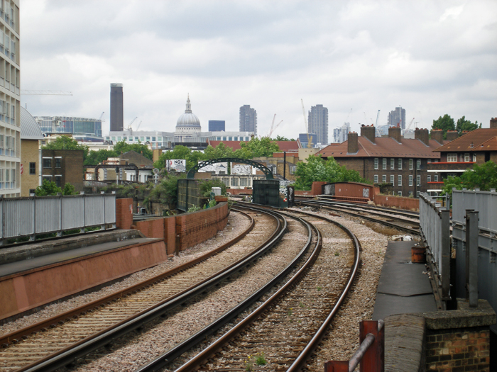A northward view from the end of platform 2 has the top of St Paul's Cathedral's dome on the horizon. Note the different design of bridge spans for each pair of tracks (1862 and 1866 tracks on the right and left respectively). Blackfriars Junction, where the double-track spur from the London Bridge to Charing Cross route joins the line, is ¾-mile distant, whilst Blackfriars station was ⅓-mile further on. © David Glasspool