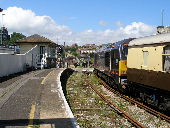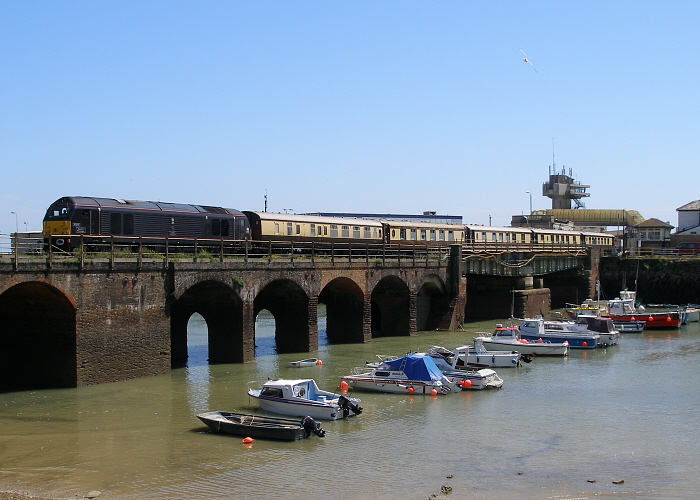 The Harbour Branch closure rumours had gathered momentum during 2006, but with continued uninterrupted use of the line throughout 2007, the end did not seem nigh. On 21st June 2007, Class 67 locomotives No. 67025 and ''Royal'' No. 67005 ''The Queen's Messenger'', were top-and-tailing the VSOE from Victoria. Notice that the viaduct arch nearest the swing bridge has been strengthened with concrete. © David Glasspool