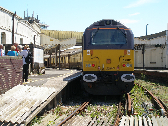 The check rail began immediately on reaching the platforms. The tight curvature of the platforms can be appreciated in this view, showing sparkling stock, but sadly, a decaying station. The ''up'' side track bed is seen returning to nature. Nos. 67005 and 67006 acquired their attractive claret liveries during Spring 2004, when they replaced Class 47s on hauling the Royal Train. © David Glasspool