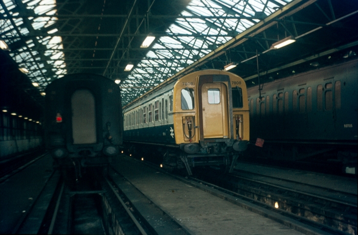 4 VEP No. 7808, the first to wear BR Corporate Blue and Grey livery, is seen stabled within Selhurst Depot,