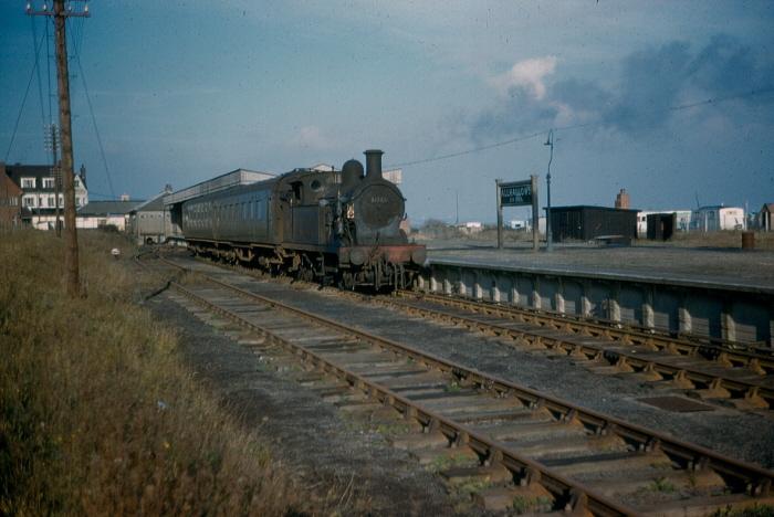 Wrainwright ''H'' Class 0-4-4T No. 31324 is seen at the head of a Maunsell push-pull set, stabled in the platform line which was commissioned as a result of the 1933 station improvements. Behind the train can be seen the single-storey pitched-roof concrete station building. The building's position prevented the full extension of this platform line, thus it is shorter than its older counterpart. The point rodding can again be seen, running along the edge of the prefabricated concrete surface. The SR's trademark swan neck lamppost design can be seen alongside the equally familiar name board with concrete surround. Observing the background, a motley collection of caravans come into view, these of which, sadly, were not enough to save the line. © David Glasspool Collection