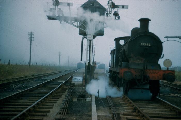 Allhallows-on-Sea is seen living up to its ''bleak'' reputation in the above view, as mist covers the marshland. In view are both platform lines and their associated run-a-round loops, in addition to the cylindrical water tower mentioned in the main text. Of note in the foreground are the signalling rods and cables, whilst on the right is the loading gauge, suspended over the original run-a-round loop. Both platform lines were occupied by carriages. Ex-SE&CR 0-6-0 ''C'' Class No. 31592 is, of course, displaying the head code of the Gravesend Central shuttle service. © David Glasspool Collection