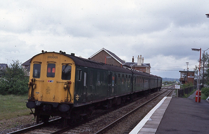 Shortened ''Hastings'' DEMU No. 203001 is seen forming a Hastings to Ashford service. This was the unit's last year of passenger operation; it was subsequently converted into a sandite unit and finally scrapped in 1996. This view also includes the 1954 signal box, behind which runs the pathway between the Hastings-bound platform and the road. © David Glasspool Collection