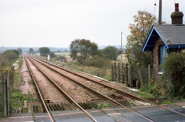 3rd November 2004 once again, this time viewing the now double track formation disappearing across the bleak marshland towards Ashford. A 60 MPH speed limit is indicated and the former level crossing keeper's building can just be seen on the right. © David Glasspool