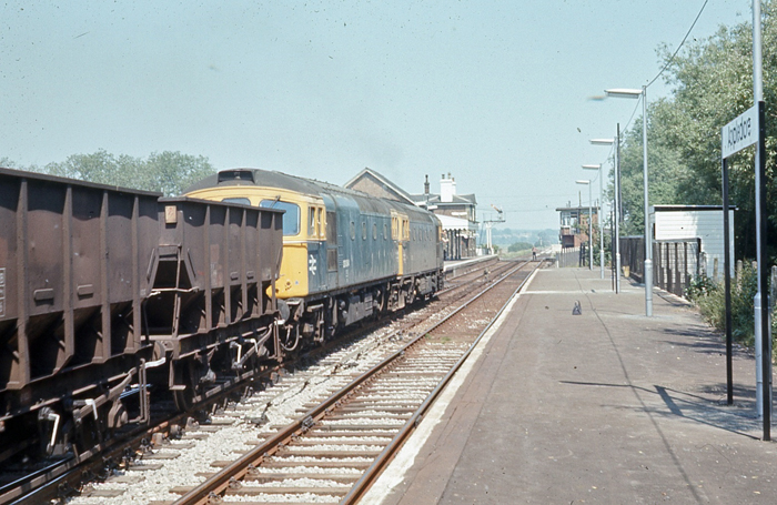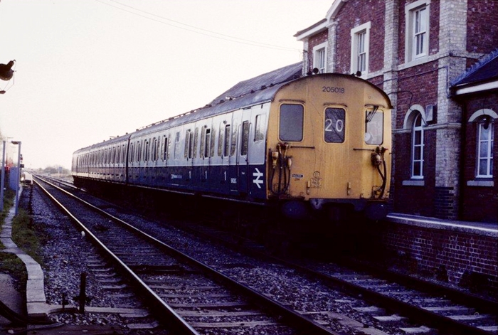 Heading in the opposite direction is Class 205 No. 205101, wearing BR Blue & Grey but with NSE ''flashes''. Here, we see a recently rebuilt ''down'' platform and, on the left, the former goods yard. The square sign with a black cross on the left serves as an advanced warning that a level crossing is ahead. © Wayne Walsh