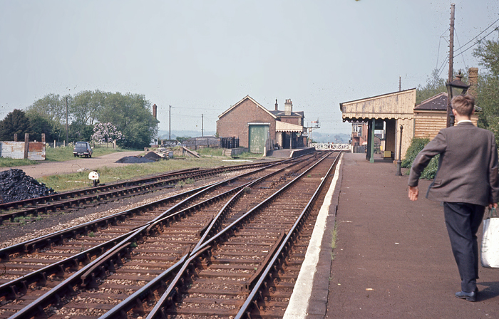 It is now worth describing the goods facilities on offer at this station. An imposing, single-track pitched-roof goods shed was positioned behind the ‘’up’’ platform, separated from the station building by the single-storey structure housing the toilets. Although the station building was of red brick construction, the goods shed featured the more common yellow brick of the SER. It was the goods shed which provided the ‘’up’’ platform with its protection from the elements, an awning being attached to its eastern elevation. Once the station had become a junction, four sidings (including the goods shed track) and cattle pens were available for use on the ‘’up’’ side, whilst the ‘’down’’ side was host to a short storage siding, sandwiched in-between the platform and level crossing.