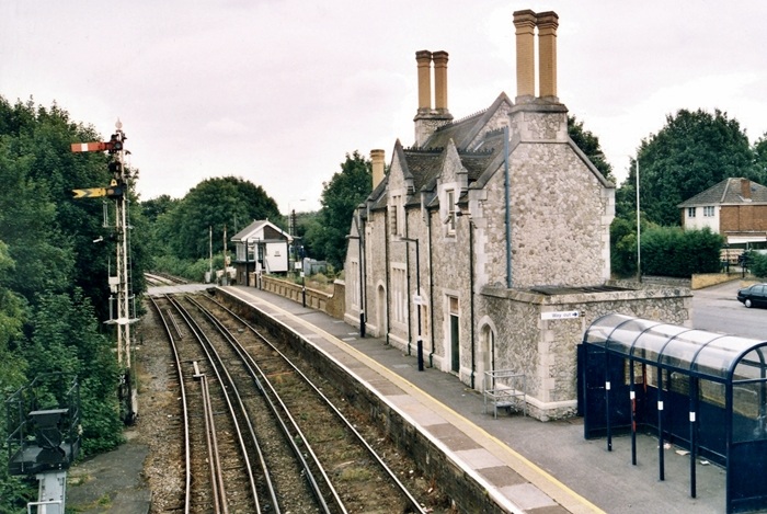 New motive power and a restored station building: ARC (Amey Roadstone Corporation) Class 59 No. 59101 eases through the platforms with a rake of identically-branded hopper wagons. This is the same Allington to Hither Green working seen in the first photograph on the previous page. Shortly after restoration, the station acquired Network SouthEast red colours, and a ''bus shelter'' had appeared on both platforms. © Wayne Walsh