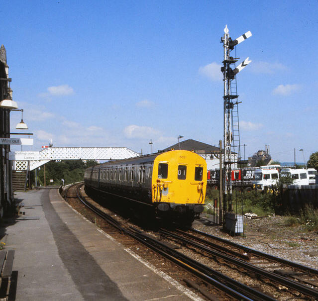 During 1984, 4EPB No. 5031 was witnessed forming the Strood to Maidstone West shuttle service. Of important historic note are: 1) the goods shed, which can be seen behind the EMU. Exactly the same design was once in use at Snodland; 2) The BR (S) lamp shades, affixed to the station building; 3) The semaphore signals, which finally had their swan song in 2005. © Chris