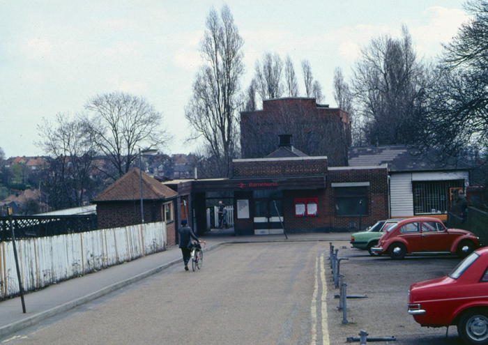 By 1982, the "up" side "high-level" entrance had received a series of modifications since the earlier photograph. The "Passimeter" booking office has been removed, the entrance having been narrowed by an extension of the brick wall and insertion of double doors. British Rail "Arrows of Indecision" signage is now evident, and it appears that half of the SER timber station building has been taken away. The vehicles populating the car park this time around are a Vauxhall Viva, Volkswagen Beetle, and a Ford Cortina. © Tom Burnham