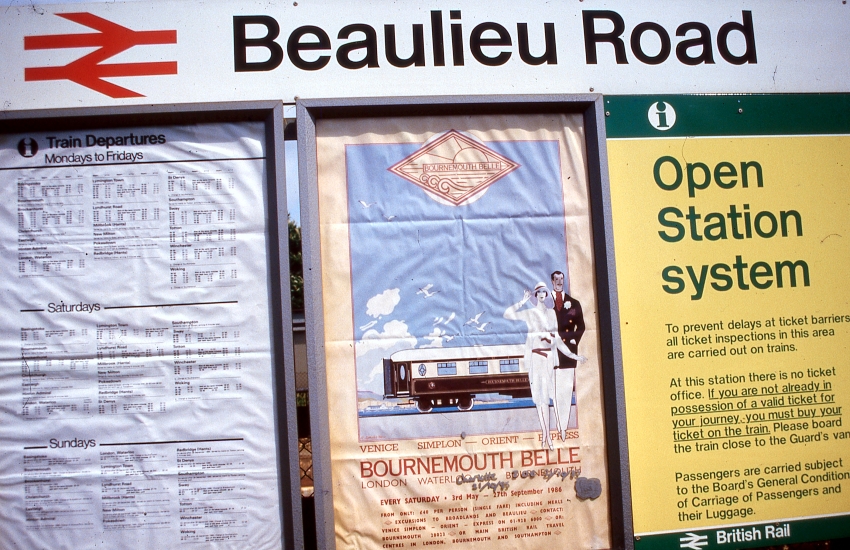 On the left is the seven-day timetable for the station, whilst the poster on the far right advertised the lack of a ticket office and the need to purchase a ticket on the train. The centre poster was promoting the VSOE Pullman service from London to Bournemouth, single fares starting at £40 per person (£115 at 2018 prices). The carriage depicted looks more like a continental Pullman car rather than one of British outline. © David Glasspool Collection