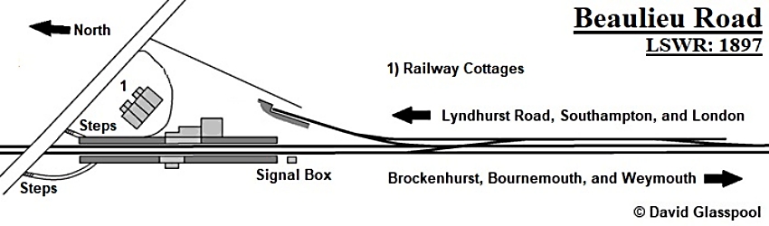 Beaulieu Road was brought into use with the ‘’Southampton & Dorchester Railway’’ on 1st June 1847, the latter of which was a circuitous extension of the LSWR’s London (Nine Elms) to Southampton main line. Having been unable to source a map of an early enough date, your author surmises that just a single platform was in evidence from the outset, on the eastern side of the running line. However, in spite of the station’s isolated setting, it still commanded a large residence for the Station Master. This was a substantial red-brick two-storey house comprising a slated pitched roof, through which protruded a trio of chimney stacks.