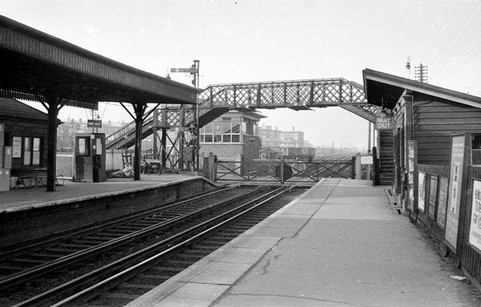 A London-bound view from the ''down'' platform shows the station layout after World War II bomb damage, the main brick building once occupying the gap in-between the ''up'' canopy and footbridge. On the far left, we can see the end of the SER timber booking office. Beyond the manual crossing gates is the signal box of 1956, which replaced an SER cabin on the opposite side of the running lines. Behind the signal box, a line of wagons can be seen in the goods yard. The presence of the ''up'' platform canopy required the duplication of the ''up'' starter signal, to ensure drivers' views were not obscured. © David Glasspool Collection