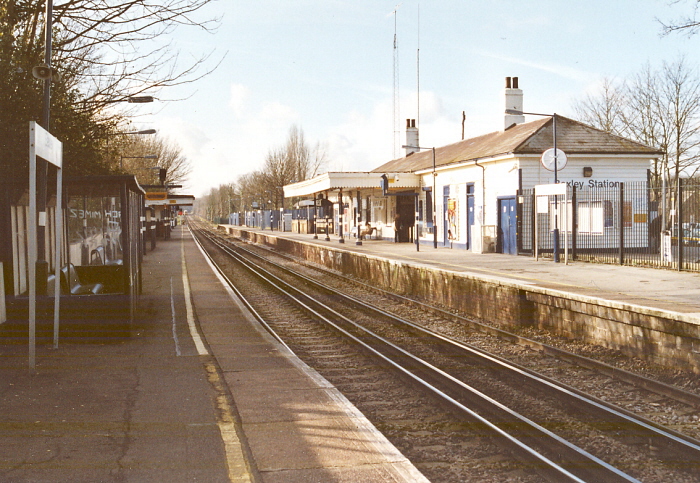 The first changes occurred on 19th June 1926 when full electric working along all North Kent routes commenced. Although third rail had appeared alongside the tracks, the station itself was little changed, and the goods yard remained. Next, in April 1955, work began on partial rebuilding and lengthening of platforms in conjunction with the ten-car EPB scheme; these formations commenced operation along the line on 13th June of that year. Goods facilities went out of use in May 1963, but fortunately, the station escaped the notable eradications of many timber buildings on the South Eastern Division - it has even kept its brick chimney stacks, features which the wooden structures at Northfleet and East Farleigh can no longer lay claim to. Unfortunately, the "up" side timber structure was not so lucky, this succumbing in about 1982, but the original canopy on this platform did remain, as did the roofs of the subway entrances. The SER signal box had also since been lost, its official closure coming on 1st November 1970 with the commissioning of the Dartford Panel. Meanwhile, there had been additions: a rectangular bus shelter had appeared on the eastern half of the "up" platform in 1968, and during the 1955 platform lengthening, concrete lamp posts supporting electrical lighting, had appeared.