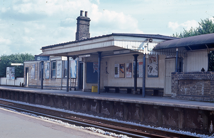 This is one of the best remaining examples of SER "economical" architecture on the South Eastern Division. The station opened with the "Dartford Loop Line" on 1st September 1866, this of which had been brought into use to relieve congestion on the existing North Kent Line via Woolwich and Blackheath. The buildings and general layout provided here virtually replicated the station just along the line at Lee, which opened on the same date. Both such stations had the luxury of a subway: these would more commonly be associated with the pre-economical era of the SER, examples being noticeable on the 1849-opened route. Indeed, a number of stations on the Sidcup route and the latterly-conceived Bexleyheath line were not even provided with footbridges, a track crossing being suffice. Northfleet may, at first glance, fall into the same category of clapboard mixed with subway, but it is worth remembering that when first built, this station was actually of brick construction. At Bexley, there were two clapboard station buildings in evidence, one twice the length of the other. The smaller example was positioned on the "up" side; interestingly this did not have a canopy extending from it. The latter was instead sandwiched in-between the aforementioned building and the subway entrance, a quite peculiar arrangement. Meanwhile, the larger clapboard structure on the "down" side demonstrated the flat-roofed canopy which was a familiar feature of the line.