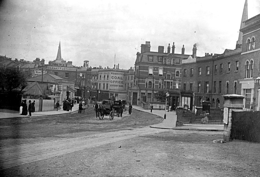 Not a car in sight, when horse and carriage reigned supreme, and when top hats and long dresses were the norm. A northward view along "Tranquil Vale" in 1892 shows a scene that, architecturally, has changed very little in the interim to the present day. The "high-level" booking hall — still in railway use today — is evident on the left, complete with a small canopy over the main entrance. The pavements look remarkably clean for the period. © David Glasspool Collection