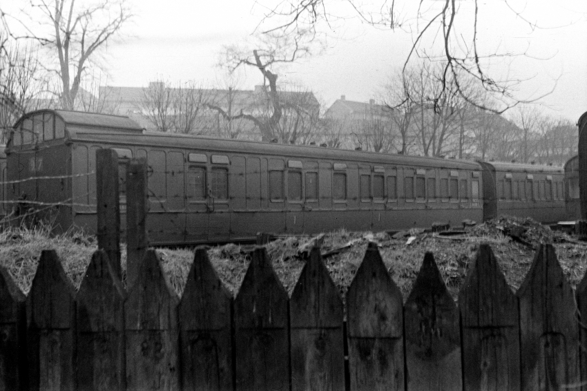 This photograph was taken at the back of the extensive rolling stock sidings positioned west of the station, on the "down" side of the running lines, and includes Ex-SE&CR "Birdcage" carriages. Pictured are the northern-most sidings that can be seen on the diagram depicting the layout in 1962. Withdrawn 4-LAV electric multiple units were stored in the sidings in 1968, and horseboxes were amongst the last items of rolling stock to be removed in October 1969. Similarly extensive carriage sidings also existed at this time at Maze Hill, in-between Greenwich and Charlton. © David Glasspool Collection