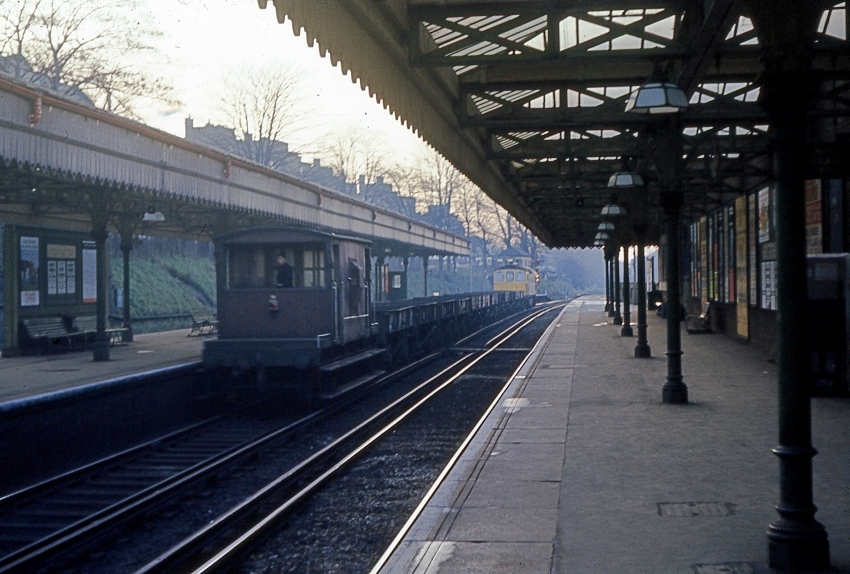 A splendidly atmospheric scene at Blackheath depicts a Type 3 (later Class 33) diesel heading westbound through platform 1 with a short freight. The locomotive was wearing all-over BR Green with full yellow warning panels. Even the guard is in view on his van at the rear of the train. The "up" starter semaphore signal arm is just about visible in front of the formation, as is part of the signal box. Although semaphores were still in use, an operational colour aspect light existed at the western end of the "up" platform and is just visible in front of the locomotive. The ornate canopies were at full length, long before being cut back, and SR hexagonal lampshades abound. © David Glasspool Collection