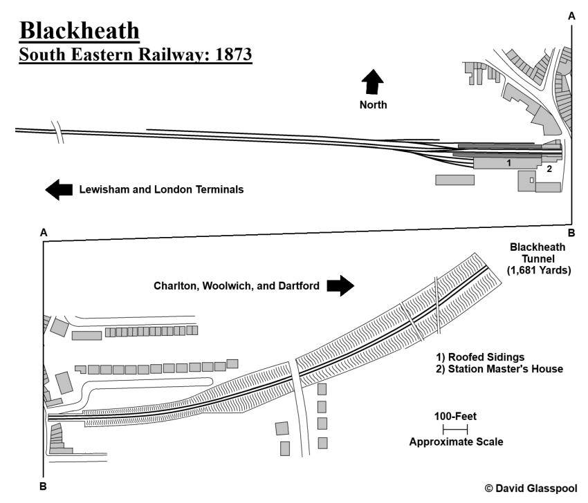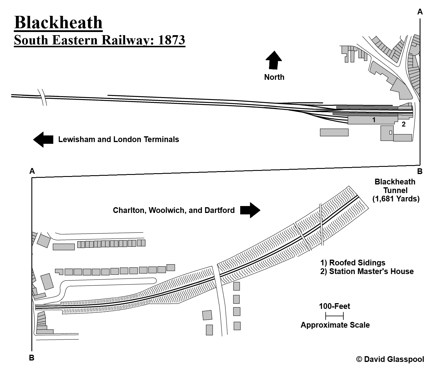 The 1873 Ordnance Survey edition reveals the same layout of station structures as that of 1850, but with enough detail to decipher platform canopies, the latter being about 90-feet and 80-feet in length on "up" and "down" sides respectively. The track layout is illustrated in the accompanying diagram: three westward-facing covered sidings sat behind the "up" (London-bound) platform; a single siding existed behind the "down" (Dartford-bound) platform; finally, two further sidings were present on the "down" side, west of the station. What your author cannot find marked on those early Ordnance Survey editions is a signal box at the station; however, there is reference to one in a Board of Trade (Railway Department) report dated 14th January 1865, concerning a collision that occurred in Blackheath Tunnel on 16th of the previous month. The same document also remarks that the North Kent Line was worked on the telegraph system of Mr Tyer.
