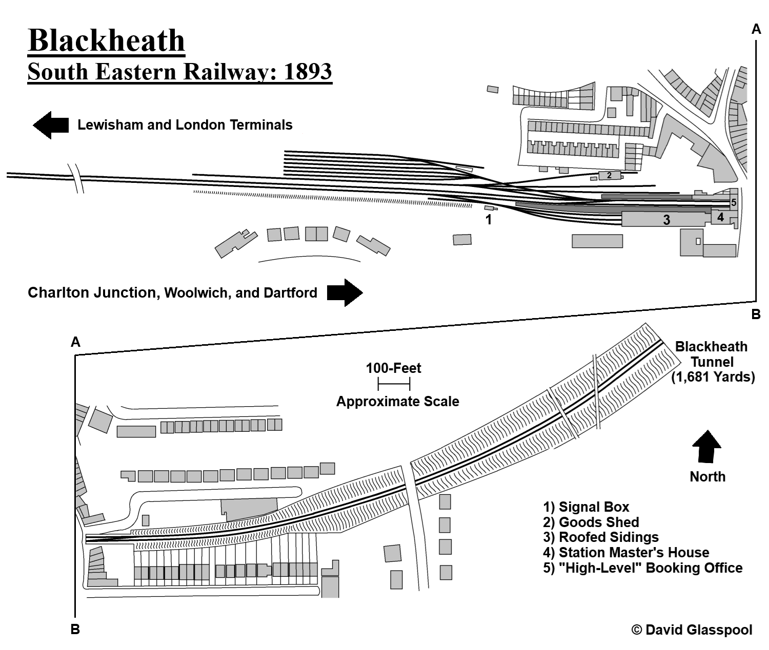 By 1893, a "high-level" booking office, straddling the tracks at the eastern end of the station, had come into use. This was a single-storey structure with hipped slated roof, which unified both sides of the station, and the main part measured 50-feet by 25-feet. Brick construction was used on three sides of the booking hall; the rear elevation facing the platforms was fabricated from timber, surely as a weight-saving measure. Flanking either side of the booking hall were staircases leading down to the platforms that could be accessed directly from the street, and the "down" platform canopy had been extended. The track layout had also been greatly expanded: on the "down" side, west of the station, seven rolling stock sidings were laid. East of these sidings, north of the "down" platform, was established a proper goods yard featuring a rail-served shed. The goods yard was equipped with a crane of five ton maximum power (ref: Hand-Book and Appendix of Stations, Junctions, Sidings, Collieries, &C, of the Railways of the United Kingdom, Henry Oliver and John Airey, 1894). A signal box of SER design, very similar in appearance to that seen on the Borough Market Junction page, was brought into use on the "up" side of the line, about 30-yards west of the end of the "up" platform. Perhaps these changes, particularly the provision of sidings, had been undertaken in preparation for the Bexleyheath line, which was brought into use between Dartford and Blackheath for passengers and goods traffic on 1st May 1895 (ref: The Lewisham and Sydenham Independent, 2nd May 1895) — your author must stress, however, that he is merely surmising on this point. In connection with the opening of the mentioned route, a second signal box was brought into use on the "up" side of the line, little over 300-yards east of the station, at Blackheath Junction, where North Kent and Bexleyheath lines diverge. To your author's eyes, the cabin appeared to be a product of signalling contractor Evans O'Donnell.