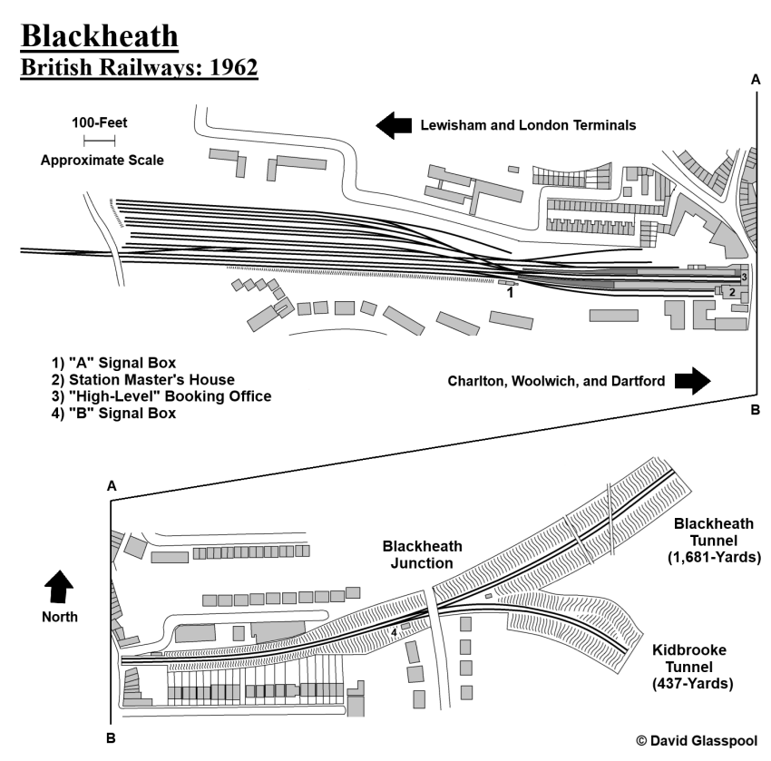 The layout at its zenith, showing the rolling stock sidings now double their previous length and greater in number. The goods shed had gone and revised connections made between the yard, sidings, and running lines to accommodate the platform extensions. Also included is the divergence of North Kent and Bexleyheath Lines at Blackheath Junction. © David Glasspool