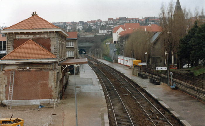 A Calais-bound view from the road bridge, immediately before electrification, shows the 960-metre-long Tunnel d'Odre in the background. The Amiens-bound platform, on the right, was devoid of any weather protection from the elements - even the subway steps, marked by "SORTIE" (exit), were exposed. Behind the camera, the line disappears into Hauteville Tunnel, beyond which the line reaches the 1962-opened Boulogne-Ville station. At the time of this photograph there was a third station which took the town's name, that of Boulogne Maritime. This station served the docks, but closure was enacted in January 1995 in response to the Channel Tunnel's opening. Boulogne had previously seen the withdrawal of Sealink's ferry service to Dover in 1986, compounded in January 1992 by the closure of the route to Folkestone. However, a "Seacat" service operated by "Hoverspeed" commenced between Folkestone and Boulogne in the following April. © Mike Glasspool