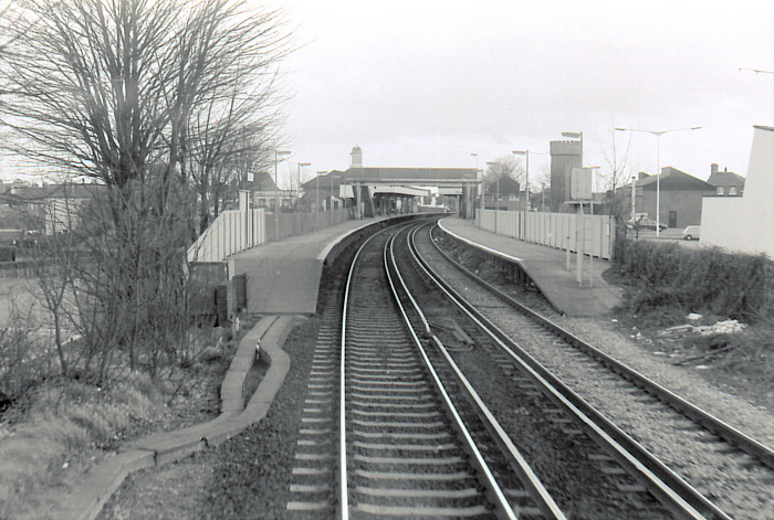 A southward view from the cab of a Ramsgate-bound service in 1985 reveals prefabricated concrete platform