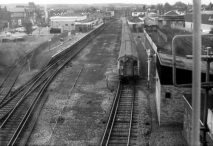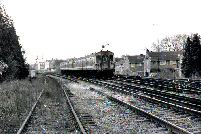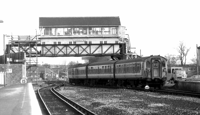 Network SouthEast-liveried 4 Cep No. 1572 was observed trundling into the station on a Ramsgate to Charing Cross service, via the Tonbridge cut-off line. The signal box is in fact a product of the SE&CR, having been built by this company during the London Bridge station enlargement works of 1901. It was similarly suspended across the tracks on that section of line which ran between Cannon Street West Junction and Waterloo Junction (Waterloo East). © John Horton