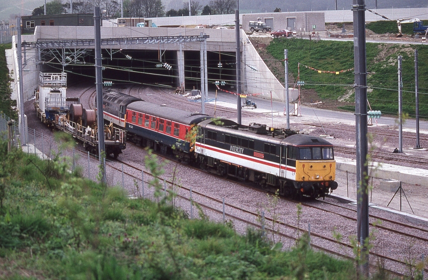 An eastward view shows that, since the previous photograph was taken, track had been laid and catenary masts installed. The maintenance depot, the site of which was seen in the previous photograph, had taken shape. The track in the foreground, curving to the left, is heading towards the tunnel that takes the railway underneath the village of Newington. © David Glasspool Collection
