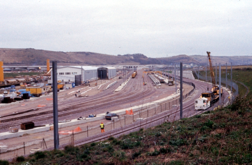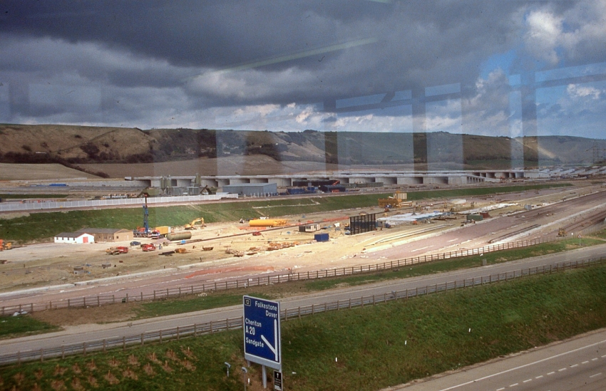 A northward view from the observation tower at Cheriton Eurotunnel Exhibition Centre shows that the gigantic viaducts linking the platforms were in place and that the track bed had been prepared, but rails had yet to be laid. The construction site in the centre of the picture was to become the diesel-electric maintenance depot. The North Downs form the backdrop. © David Glasspool Collection