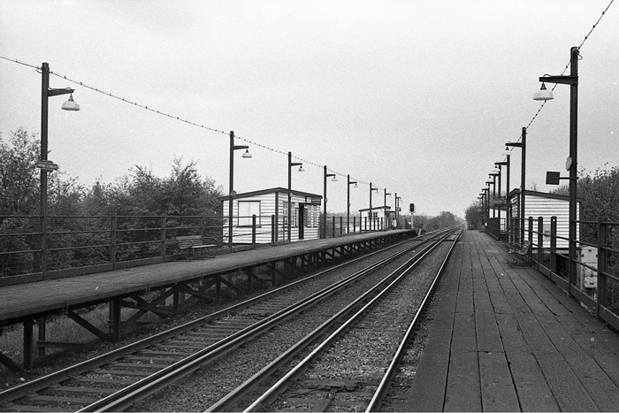 An eastward view shows that the generous timber waiting rooms had gone and, in their place, small glazed shelters installed, these of which were lined on three sides by palisade fencing. The timber planks of the platforms were now underneath a layer of asphalt. © David Glasspool
