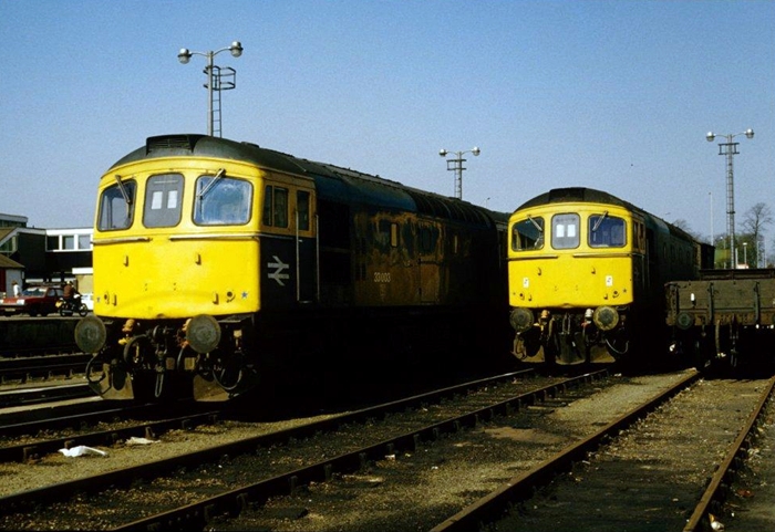 No. 33003, plus classmate, is seen stabled in the sidings at Ashford, which existed north of the platforms. The diesel was involved in an accident at Dormans in July 1987, severely damaging one of the cabs. As a result, it was permanently withdrawn, eventually being scrapped at Eastleigh in September 1990. © Wayne Walsh