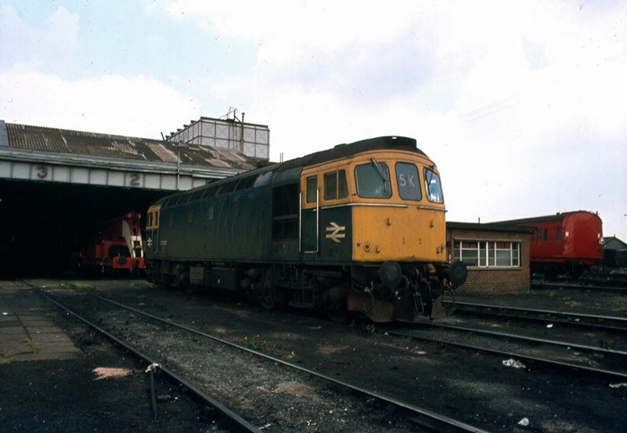 No. 33202 was one of a batch of twelve Type 3 diesels to have narrow bodies for use on the ''Hastings'' line via Tunbridge Wells Central. The grubby diesel is seen outside the former steam engine shed at Hither Green, with a breakdown crane behind and, to the right, a former steam-hauled carriage. © David Glasspool Collection