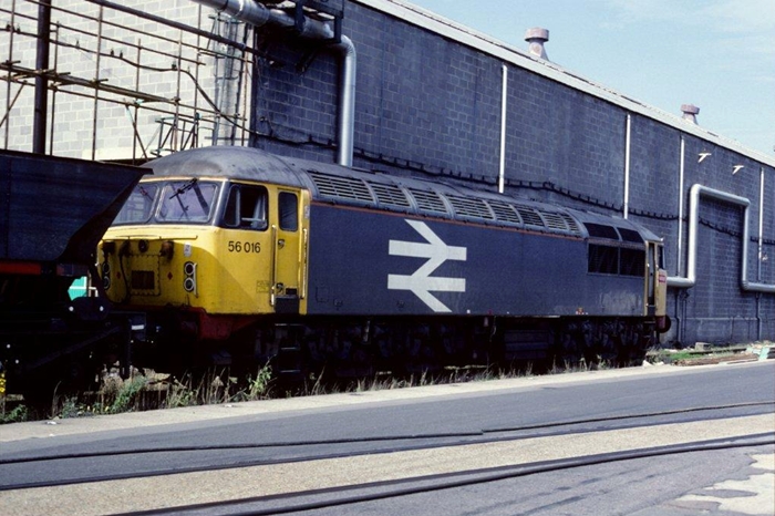 No. 56016 is seen at Brookgate sidings, within the Reed Paper Mill complex, New Hythe, fronting coal hoppers.