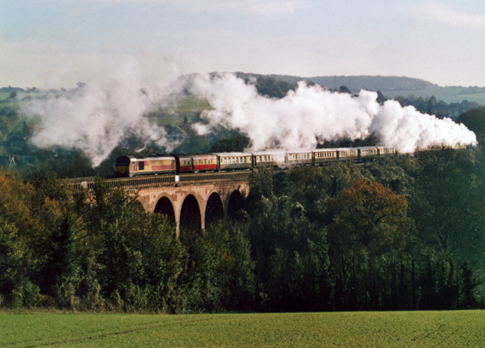 No. 67008 trailed on the spectacle that was the 11:45 Orient Express from London Victoria to Folkestone West, led by unrebuilt Battle of Britain Class No. 34067 "Tangmere". It was scheduled to arrive at Folkestone at 15:15 and is seen making its way over Eynsford Viaduct on the outward leg. The service was originally bound for Whitstable, travelling via Chatham, but this was altered due to last minute engineering works. © David Glasspool