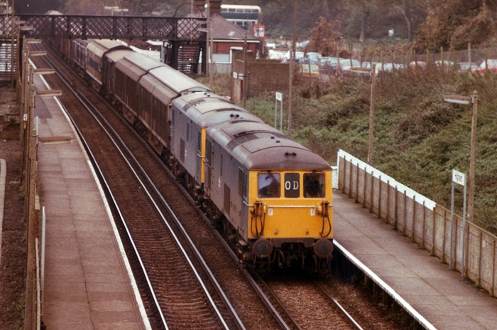 In late 1983, double-headed Class 73s wearing BR Blue livery are seen passing Higham's ''up'' platform with a rake of ferry vans, most of which are VTG ''Cargowaggon'' variants. © Chris