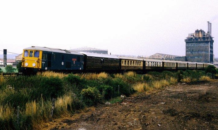 No. 73129 is seen in its later guise of ''City of Winchester''. It is heading southwards down the Medway Valley Line, past Reed Paper Mill, New Hythe, with the ''British Pullman'' part of the ''Orient Express''. © Wayne Walsh