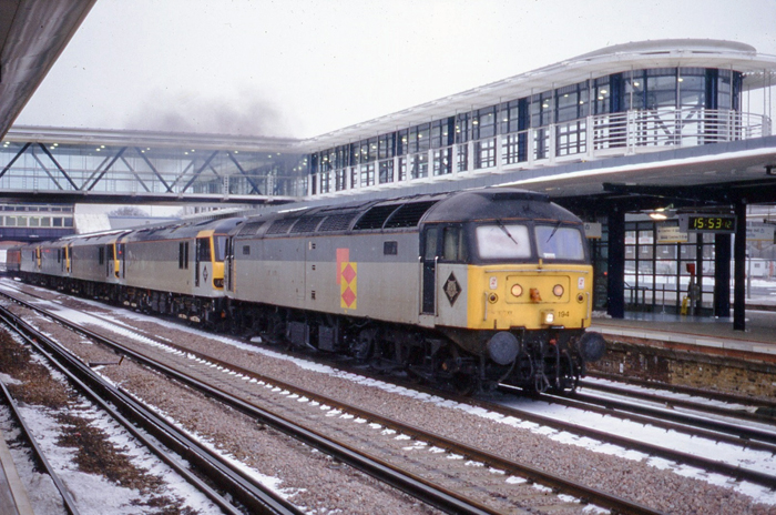A standard working of the era. Class 47 No. 47194 is seen hauling four brand new Class 92 electrics through the newly-christened "Ashford International" station. The Class 92 fleet was not yet authorised for third rail operation, so between Wembley and Dollands Moor, locomotives had to be diesel-hauled. At the end of the formation is a BR Mk 2 coach in the red and blue colours of the Railway Technical Centre, Derby. © David Glasspool Collection