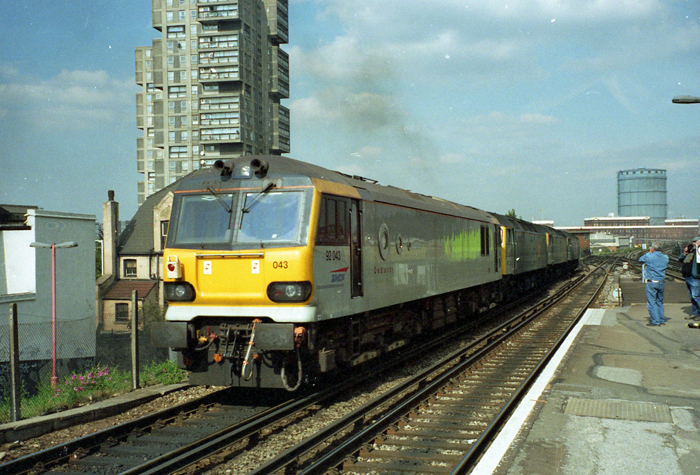 All locomotives were finished in two-tone grey, which had become a familiar scheme on the fleets of the former British Rail freight business sectors. Here, SNCF-owned No. 92043 "Debussy" is seen being dragged through Wandsworth Road by three RfD Class 47 diesels, heading to Wembley. The owner's logo can be seen on the cab side, below the number. The name, as per most of the class, took the form of a transfer. © David Glasspool Collection