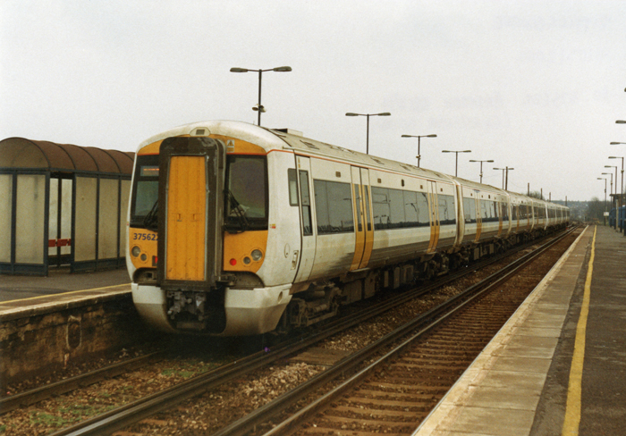 A somehwat grubby unbranded No. 375622 is seen forming the rear portion of an eight-car service at Sittingbourne, Faversham-bound. Below the driver's window was formerly "Connex" branding, this being swiftly removed after termination of the franchise. This area was eventually filled with a duplication of the unit number. © David Glasspool