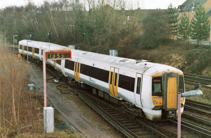 Three-car No. 375303 is seen making its way out of "Jubilee Sidings" at Tonbridge West Yard. These are secure sidings, surrounded with palisade fencing, alongside the main freight yard. © David Glasspool