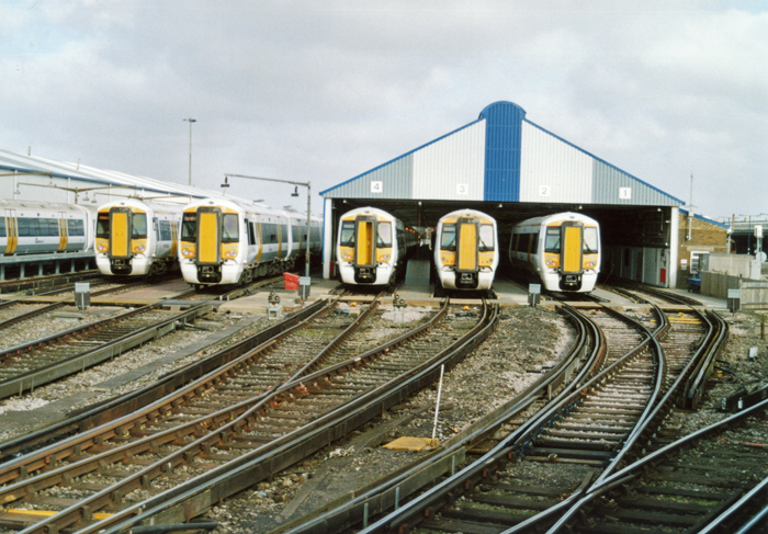 A line-up of Class 375 units is seen at Ramsgate; the station is just out of view, to the right. The pitched-roof building seen here was formerly the carriage cleaning shed for locomotive-hauled stock, before the ''juice'' was switched on in 1959. © David Glasspool