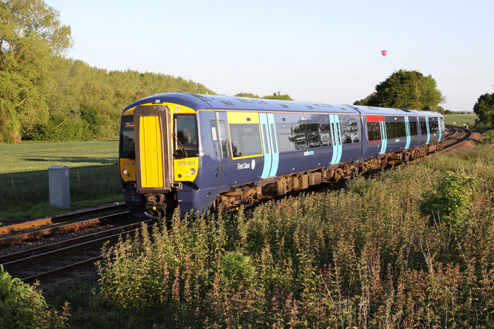 Newly refurbished No. 375301 is seen on the Medway Valley Line working the 19:42 Paddock Wood to Strood. The yellow window surround indicates the First Class seating, whilst the purple surround shows the wheelchair accessible area. In the background can be seen the Virgin hot air balloon taking off from Paddock Wood. © Wayne Walsh