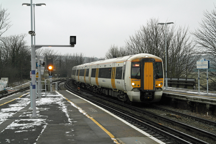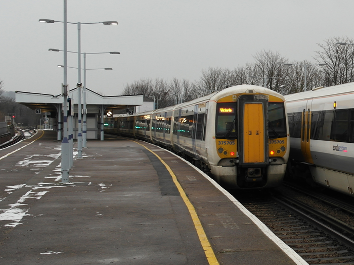 The banner repeater signal shows "all clear" as No. 375705 departs for Victoria. A variation of the basic "Southeastern" livery is observed here, the unit possessing doors painted in light blue rather than the more customary yellow. © David Glasspool
