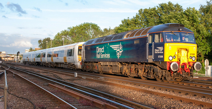 Off for refurbishment: No. 375304 is seen leaving Tonbridge at 20:25 behind Class 57 No. 57306 (formerly Class 47 No. 47814), bound for Derby Litchurch Lane. © Wayne Walsh