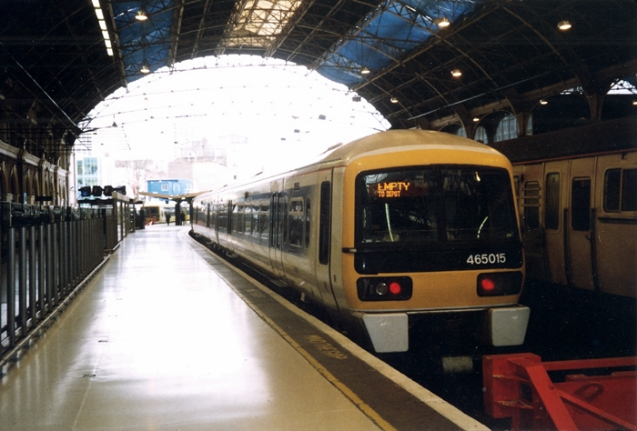 Parked at London Victoria's platform 2, empty stock, No. 465015 is seen sparkling in the blue and yellow scheme adopted by former franchise holder "Connex South Eastern". The scheme first appeared on Connex's Class 365 fleet, but as far as the Class 465 fleet was concerned, it was replaced by a white/yellow/black livery. The glass partition on the left appeared when ticket barriers were installed at the terminus in 2001. © David Glasspool
