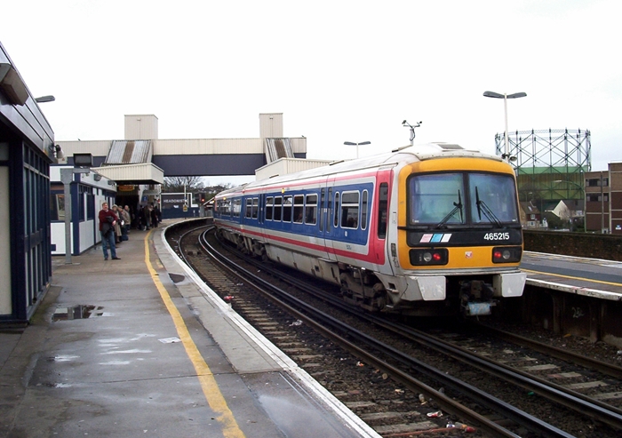 A grubby No. 465215 is seen stabled at Dartford's platform 3, forming a Victoria via Bexleyheath service. When built, the units came with a ten-year paint warranty. © David Glasspool
