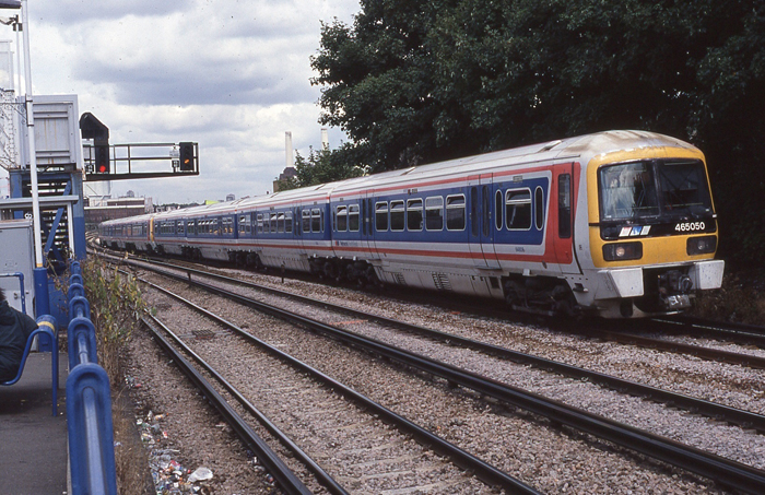 Network SouthEast (NSE) was broken up into a series of shadow franchises in 1994, these of which were privatised in 1996. However, long after, the NSE scheme still reigned supreme on the "Networker" fleet. No. 465050 is seen leading a classmate at Wandsworth Road on what is thought to be a Victoria to Dartford service. © David Glasspool Collection