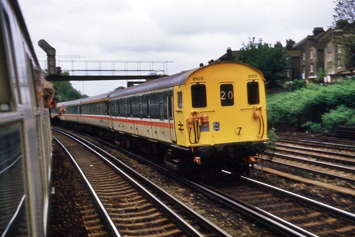 Resplendent in InterCity Executive colours with yellow wraparound cab ends, No. 9103 is seen on the southern approaches to Clapham Junction, Victoria-bound. The first vehicle behind the GLV is a First Open BR Mk 2f of Class 488/2. © David Glasspool Collection