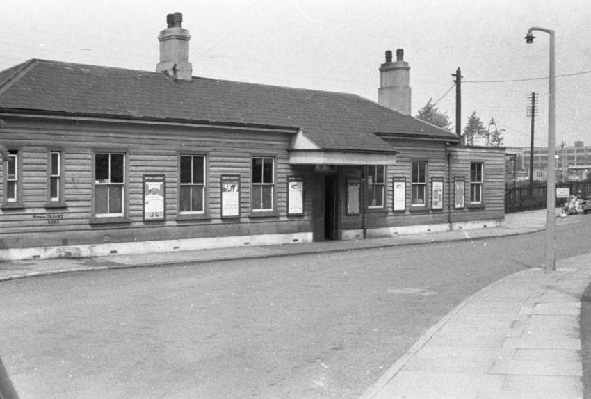 The SER timber station building is seen nearing the end of its existence. Typical features include the hipped slated roof and sash-style windows. One of the advertisement boards, headed ''British Railways'', is promoting horse racing at Epsom. On the right, in the background, can be seen the imposing buildings of Vickers. © David Glasspool Collection